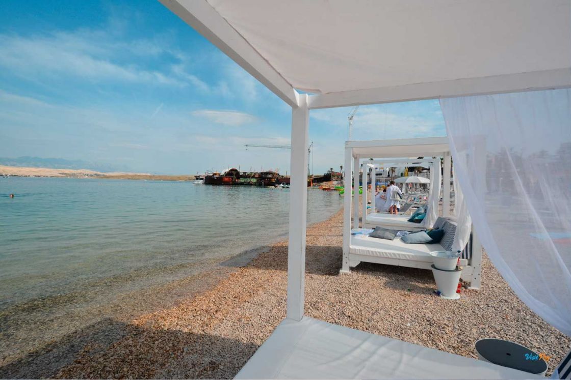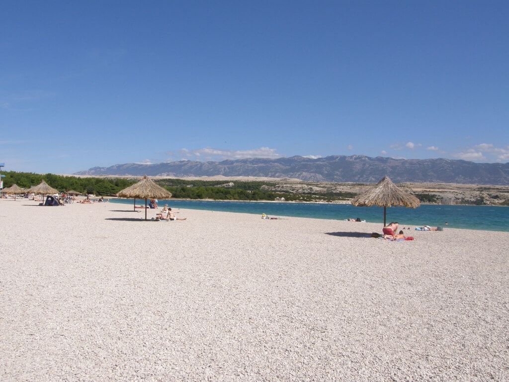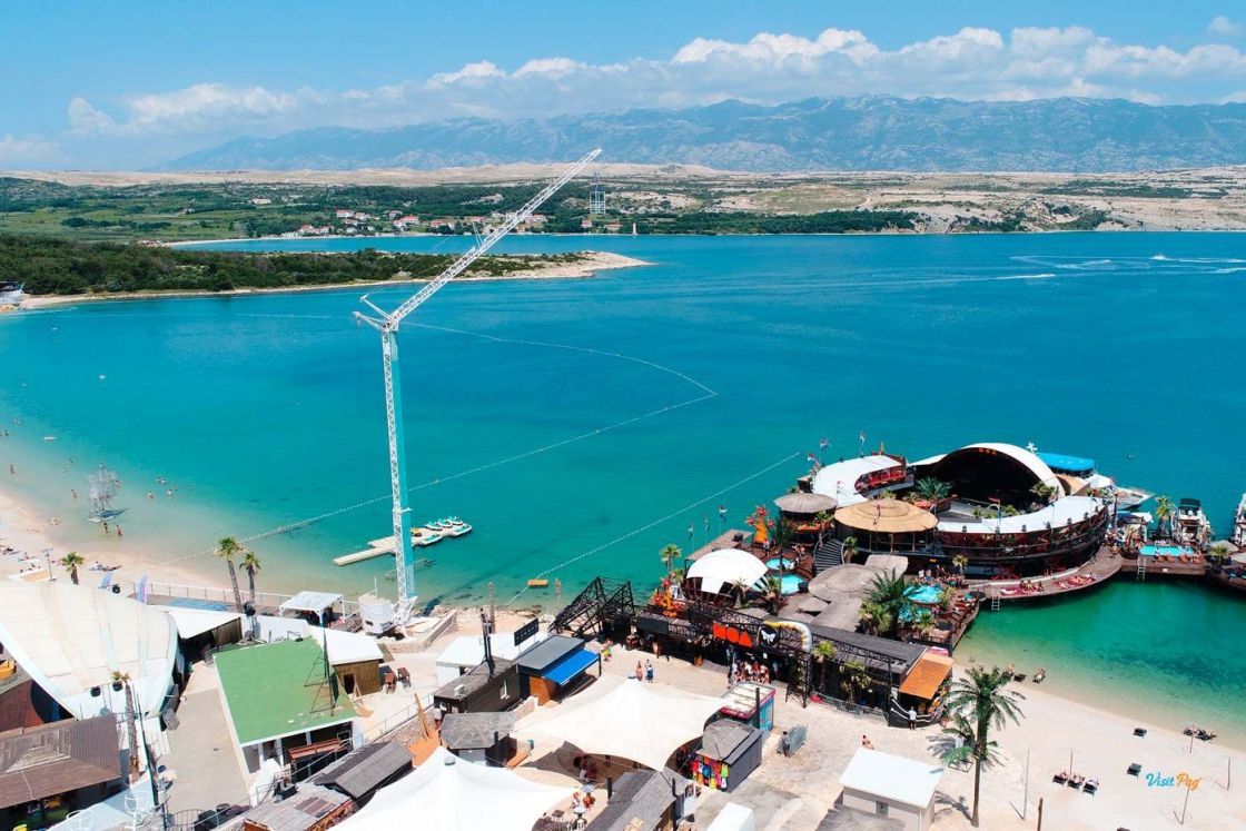 Zrće Beach is situated on the northern part of the island of Pag, along the Adriatic coast. The beach is a long, pebbly stretch with crystal-clear waters and surrounded by pine trees, creating a picturesque setting for beachgoers.